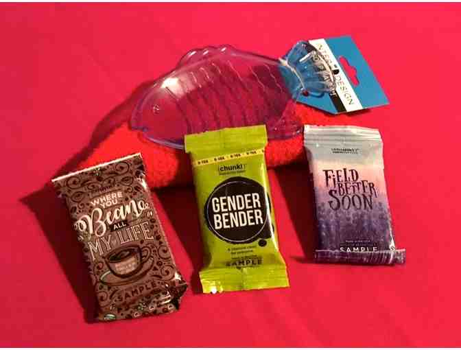 This soft plastic Soap Dish is unbreakable and easy to clean. It's just the right size for some mini-bars too! We have included a red washcloth, to make it pop for Valentines day. Courtesy of SKH.po.sh