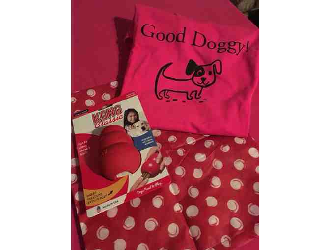 This "Good Doggie" t-shirt is medium in size (women's sizes.) It comes in a Thirty-One "Swirl Dot" gifting bag, and a Kong toy ... to let you favotite dog lover (and doggy) know how much you appreciate them.