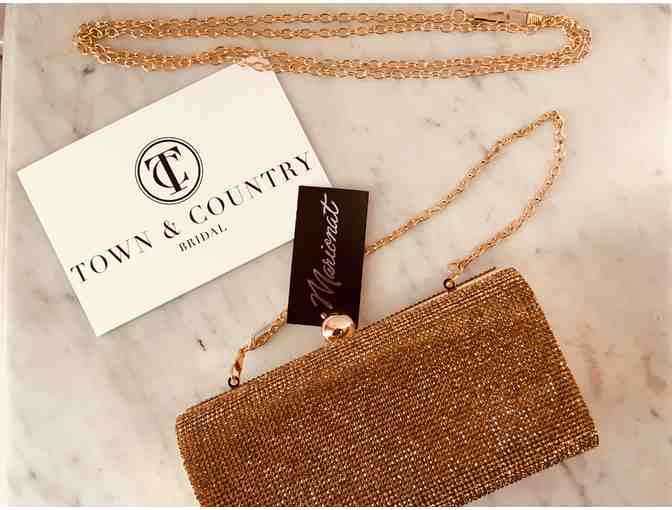 Feast your eyes on this timeless, embellished gold evening clutch donated by Town & Country Bridal. Clutch is made by Marionat and includes chains of two different lengths so the purse may be worn three ways.