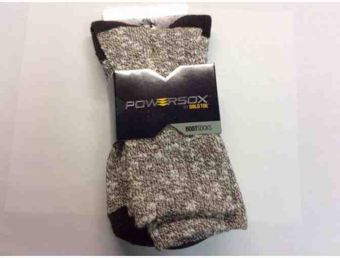 Powersox by Gold Toe. They are the perfect choice for work, outdoor or simply lasting comfort. AquaFX keeps feet dry. Cotton blend comfort. Arch brace for support. Reinforced heel and toe. 2 Pair, size Large (shoe size 9-12), brown.