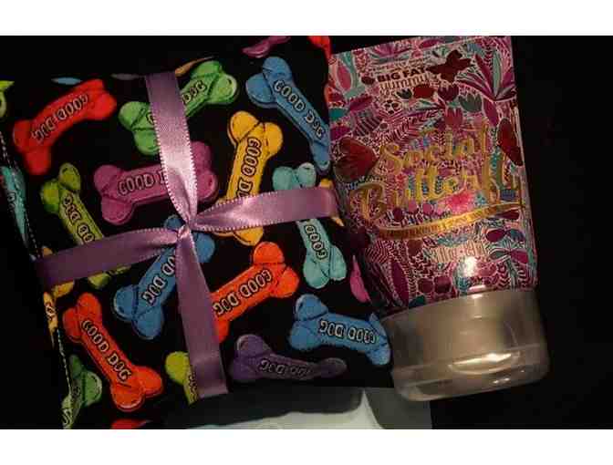 What an adorable combo this is! Handwarmers crafted by AJ VanderEnde can be warmed in microwave or can be cooled in freezer. They also make nice coffee mug coasters, or wrist rests... for those who spend a lot of time at the computer. This particular design is coupled with "Social Butterfly" handcreme from SKH.po.sh /