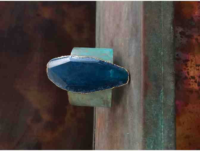Artisan patina cuff adorned with gold-plated, faceted blue agate by designer Jen Jaudon. As with artisan products, the beauty of your Rust+Revival bracelet will depend on your care. To reduce damage to the finish, avoid water and any harsh chemicals.