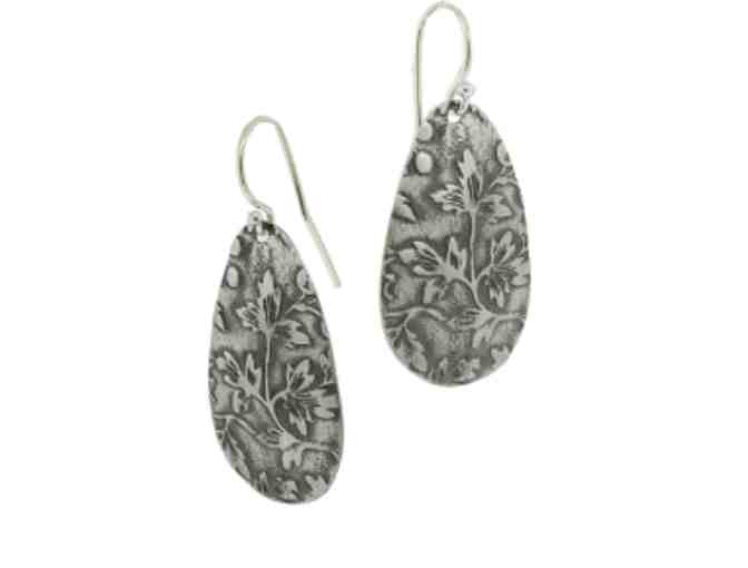 Sterling silver free-form teardrop earrings with falling leaf motif and antiqued finish.