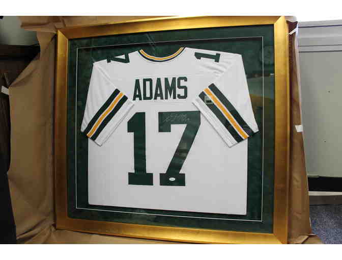 A certified, autographed white Packer jersey of Devante Adams, WR for Green Bay. The jersey is custom matted in Packer green and framed in Packer gold. The framed jersey comes with a certificate of authenticity attached to the back of the frame.