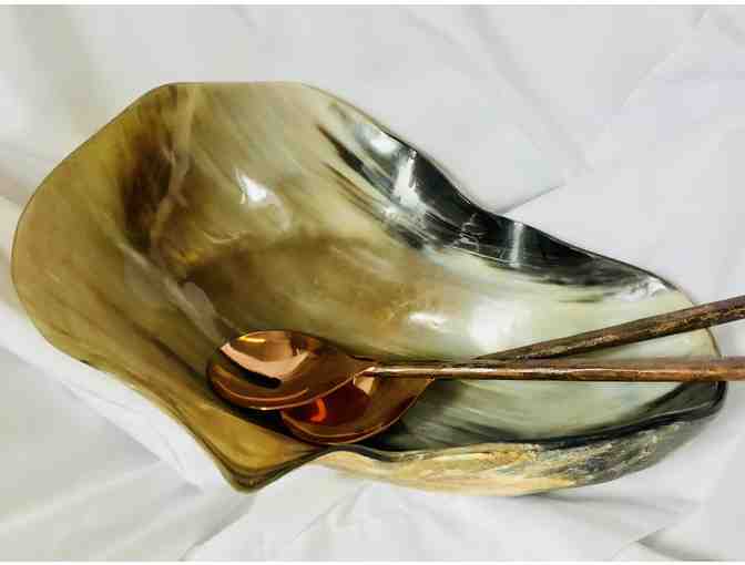 This beautiful Horn Serving Bowl and Copper Salad Serving Set would be the perfect addition to your everyday dinner or special occasion.