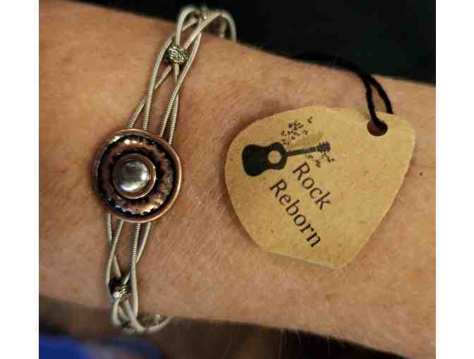You are bidding on a handcrafted guitar string bracelet. It would be a lovely addition to your jewelry collection.