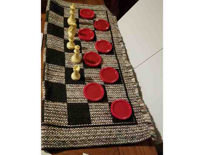You are bidding on a large woven mat for checkers, chess and tic tac toe. On one side is the checkerboard and on the other side is Tic Tac Toe. Comes with both checkers and chess pieces.