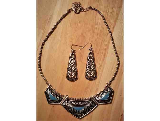 You are bidding on a necklace and earring set to give you that southwestern look.  The earrings are silver and measure approximately 1 1/2" long.  The necklace is silver and turquoise on an adjustable chain that goes from 15" to 18".