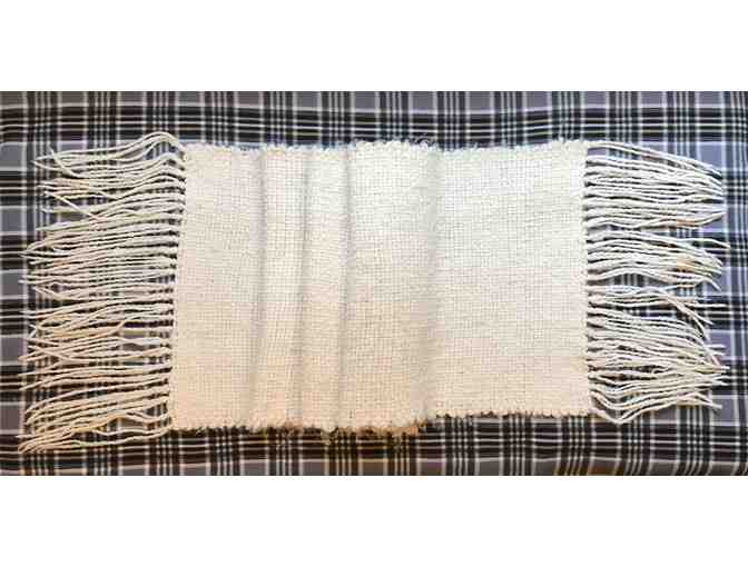 A beautiful wool throw, woven by Martha Cram, who was director of the Nor'wester Craft Shop in the early 1970s. It would make a lovely lap blanket for you and a friend while sharing a loveseat on a romantic Saturday afternoon. Or throw it over the foot of your king size bed to keep your feet toasty all winter. 90” x 22”, with an 11” fringe at each end.