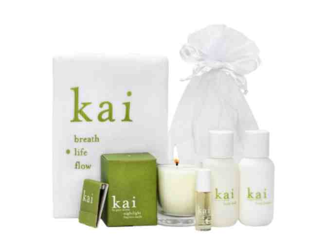 It includes: kai signature perfume oil, nightlight candle, matches, 2 oz body lotion, and kai yoga tank top - all wrapped up in an organza bag
