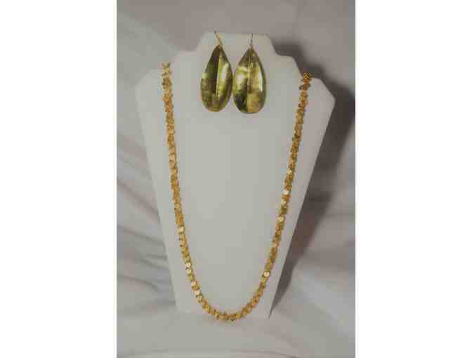 Brave Hammered Gold Leaf Earrings and Brave Long Matte Gold Coin Chain