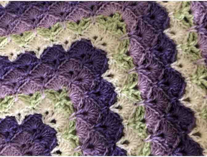 Are you looking for the perfect baby shower gift or something soft and snuggly to wrap your baby in? Take a look at this crocheted baby blanket! This blanket features scalloped edges for that sweet touch of character. The colors that make up this blanket are sweet and soothing: white, lime green and three shades of purple. This blanket is 34 inches long by 34 inches wide, perfect to swaddle the little one in your life!