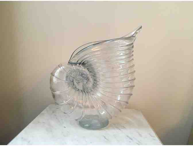 You are bidding on a clear glass shell vase. It may be used as a pitcher or a vase. Donated by Elan Design Studio.