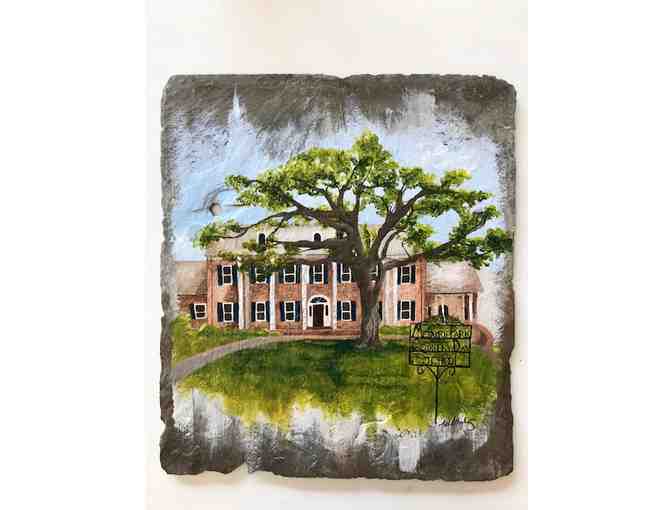 You are bidding on a gorgeous, one-of-a-kind painting of our beloved school on a slate tile, which was from the roof of the building. This slate tile is painted with arcylics and a masterpiece by Country Day's Michelle Haysley. The tile measures 14"x12" and is coated in resin for safe keeping.