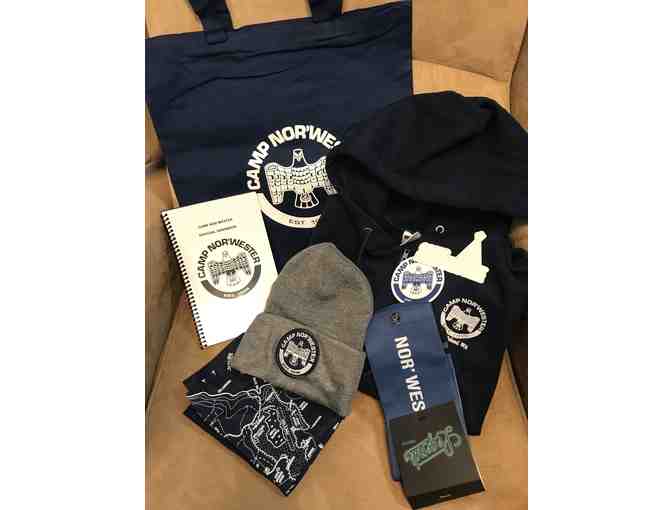 All the Nor'wester Blue you could ever want! Outfit yourself from head to toe in camp's signature color with this incredible assortment pack. Includes limited edition tote bag, small songbook, hoodie, socks, knit cap, stickers, and an 80th Anniversary bandana featuring a map of camp.