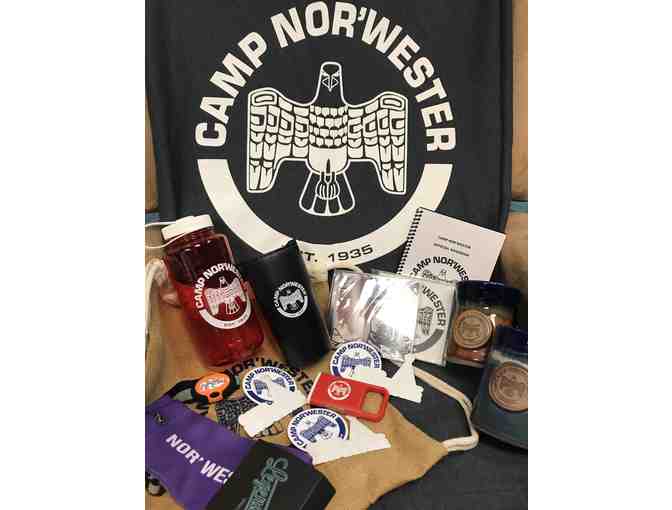 Bring home the treasures of Trader Horn with this ultimate assortment of Nor'wester swag. Includes a sweatshirt blanket, jute drawstring bag, small songbook, water bottle, travel mug, flashlight, headlamp, socks, stickers, 2 limited edition 80th Anniversary glazed pottery mugs, and 2 CDs of camp songs performed by Nor'wester campers and musicians.
