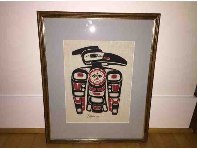 "Raven Steals the Sun" is printed on linen. The artist, Barry Herem, is a long-time supporter of Camp Nor'wester. This print was made in 1984. A companion piece to this work is "Bear." Framed dimensions: 17.5" x 21.5”. Print measures 10.5" x 13.5”.
