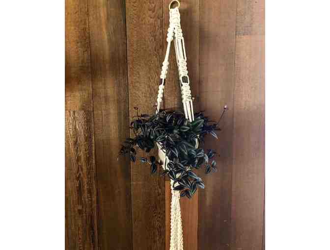 This macrame plant hanger was made by former camper and counselor Maggie Voinot-Baron. The plant hanger is made with 5mm cotton rope, three wood beads, and a solid brass ring. The plant hanger is approximately 36" long and will hold pots of a variety of shapes and sizes. (Plant and pot not included.)