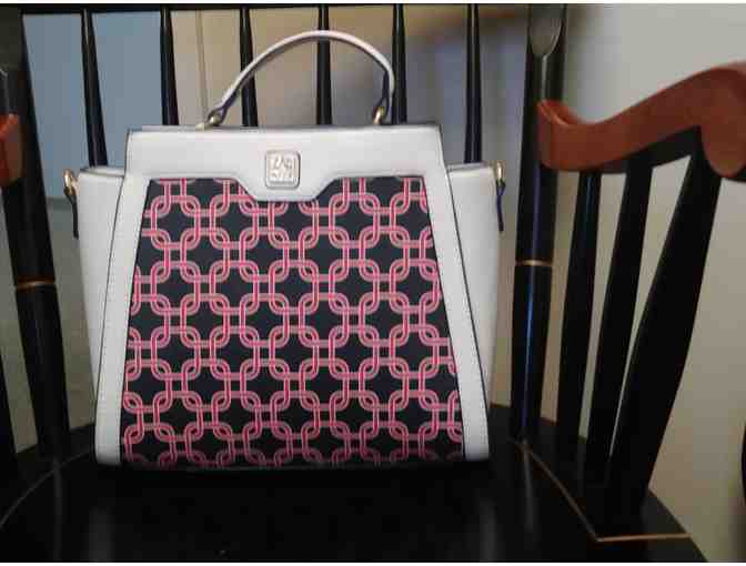 Look stylish this Spring with this white handbag with navy blue and magenta details. Purse opens up to two compartments. Purse was purchased at Charming Charlie.