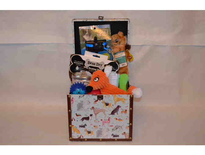 Millie Green Debonair Dog dog chest with reflective, retractable tie out, Bone Dry dog towel, Be the Dog Your Owner Wants You to Be dog treat mix, Paw Treat jar, Zippy Paws Jiggler dog toy, Posh Paws Fox toy, Porcupine dog ball, Squeaky ball and bone.