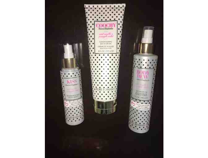 Pure Romance gift bundle: Conditioning Shave Cream, Body Dew moisturizing oil spray, Kiss Body Spray
