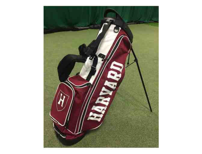 The Harvard Ping golf bag has a four-way top, seven pockets, full-contact base, and front-adjusting padded shoulder straps. The side of this crimson and white golf bag is decorated with Harvard lettering.