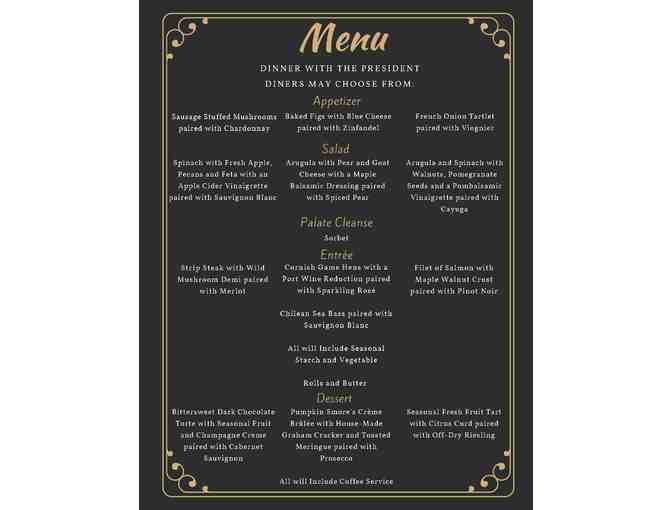 You and three of your guests (total of four people) will have the opportunity to have Dinner with Interim President Elizabeth Meade at the President's Residence on Cedar Crest College's campus.