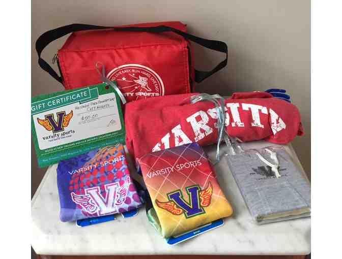 You are bidding on a gift certificate for $50 to Varsity Sports. You also receive a Varsity Sports lunch bag, T-Shirt size large, two pairs of of socks, a sticky pad set and a backscratcher.
