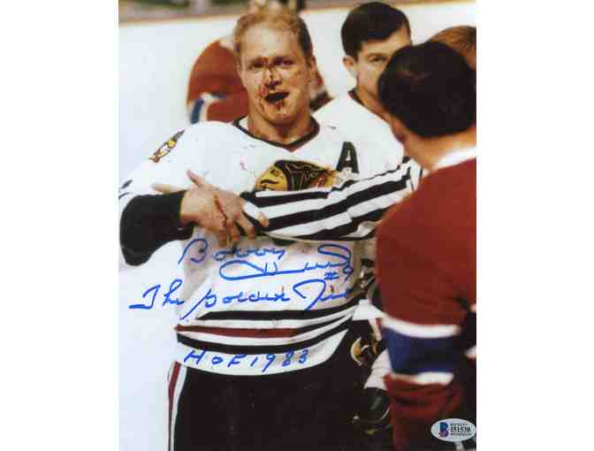 Bobby Hull Chicago Blackhawks Beckett (BAS) Certified Authentic Autographed 8x10 unframed Color Fight Photo #1 - Inscribed #9, The Golden Jet & HOF 1983 - Boldly autographed with blue sharpie pen.