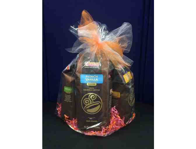 This basket of 5 one pound bags of ground Dunkin Donuts coffee is for the extreme coffee lover! Basket includes: Original Blend, Hazelnut, French Vanilla, Dunkin Decaf and Dark Roast. "America Runs on Dunkin!"