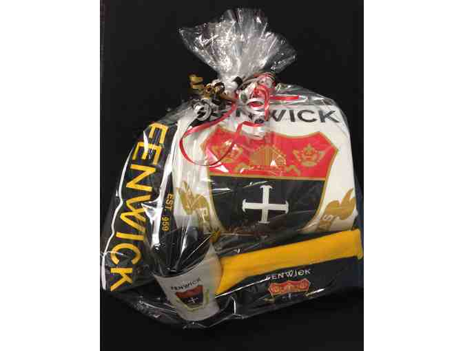 Bishop Fenwick High School Spirit Package includes a black Fenwick t-shirt, a white Fenwick t-shirt, scarf, pen, flashlight and a mug. All items incorporate the Fenwick colors and logo.