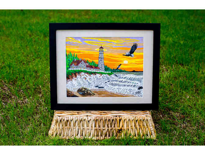 Framed painting, "Lighthouse at Sunset" by Holly LaVoie (SOM Faculty), mixed medium: acrylic, oil, ink, pencil