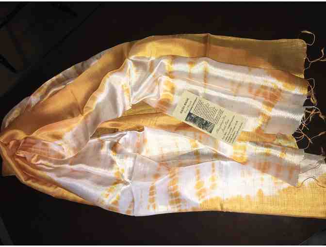 Handmade Thai silk scarf in gold and white with fringe. Perfect way to accessorize and show your Cedar Crest pride!