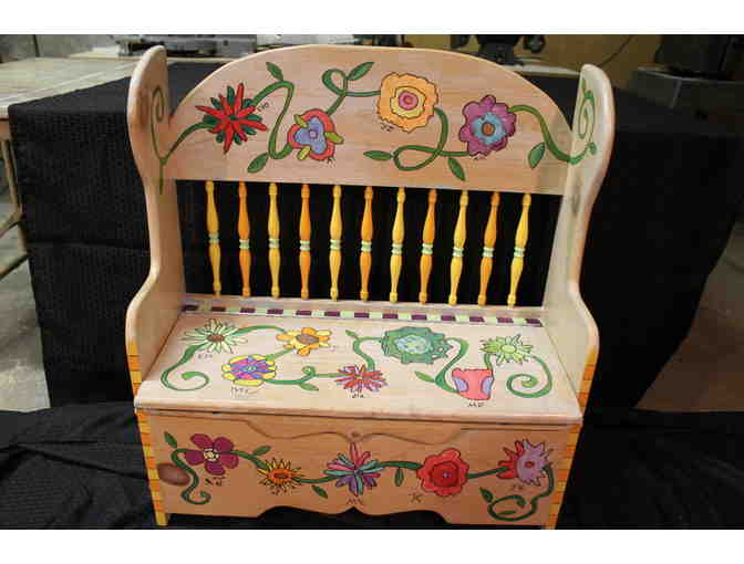 Each of the 3rd grade classes gave a facelift to an antique bench and the results are breathtaking! Students designed their own whimsical flowers, transfered their designs onto the bench, and painted them. The flowers were then outlined with a wood burner by our Projects Chairperson, Mrs. Medina. Each bench opens up for storage of things like toys, winter hats & scarves, or garden tools. These are truly one of a kind benches that can be used indoors or outdoors and will be treasured for years to come.