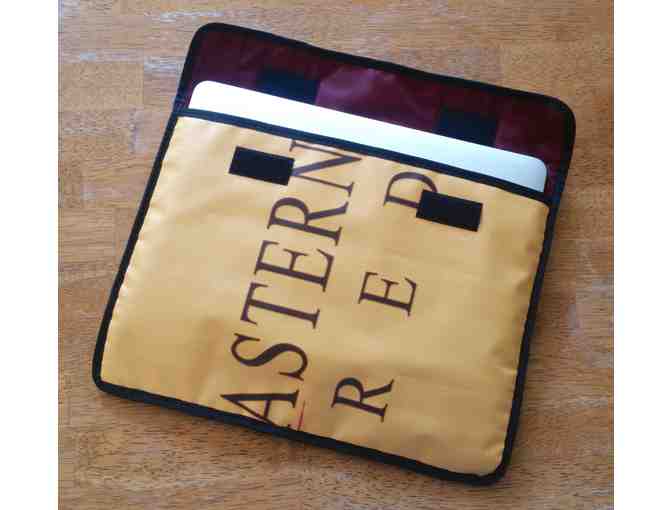 Basic laptop sleeve for 13" Macbook Pro, Macbook Air, or other 13" slim laptops. Made with recycled bike tubes and recycled sign vinyl. Padded with recycled window wrap (a thin, flexible foam-like material) recovered from a construction site in Moab. THREE recycled material in one product. A durable nylon packcloth lining in maroon gives it a nice finished look. Two velcro closures.