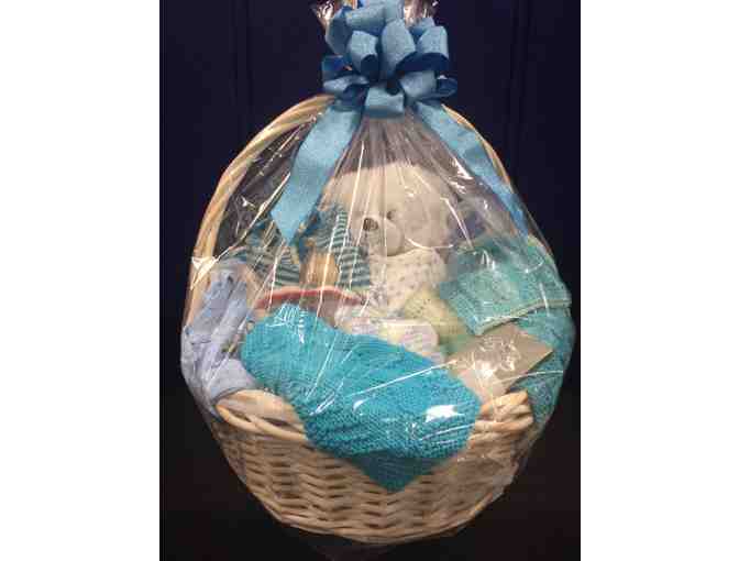 This Baby Basket is filled with beautifully hand-crafted items which will be keepsakes for years to come. Included are a hand-knit blanket, washcloth, hand-knit hooded sweater, Teddy Bear, picture frame, 2 receiving blankets, 2 onesies, and a tooth fairy doll.