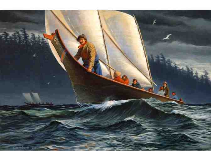 Western Washington traveling canoes, on the way to a potlatch, race over the waves before a November southwest wind at the turn of the century. The travelers relax and enjoy the ride, now passing through a welcome patch of afternoon sun. Only the steersman strains to keep the driving canoe off the wind. All the passengers are dressed in European fashion, typical of the period. The only visible example of traditional native dress is the cedar bark hat worn by one woman.