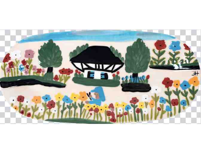 You are bidding on a Clementine Hunter "Tending the Flowers" Platter. Flower gardens were a popular pastime of folks on Cane River adding color to the yards and a source of owner's pride. Zinnias were Clementine Hunter's favorite flower which thrived in the summer heat on Cane River.