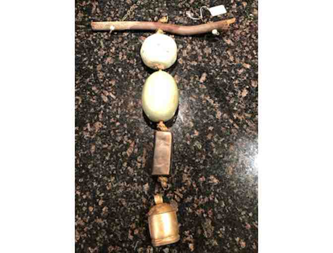Beautiful handmade clay beads 4-5" in diameter each with small Noah bell at bottom.  Local artist.  One of a kind.