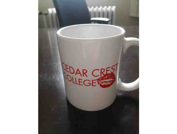 Enjoy your hot coffee or tea in this Cedar Crest College mug. This mug is white and features Cedar Crest College and "Kissing lips" in red imprint.