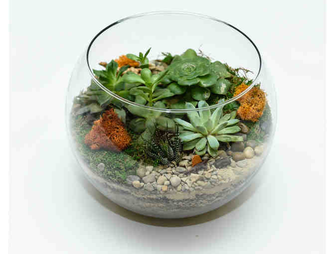 This 8"x11" live terrarium is a whole world ready for you to enjoy! Perfect for displaying in your home, the terrarium includes a large glass bowl with beautiful succulents nestled in a bed of moss and rocks. This complete ecosystem is also home to a tiny, friendly, plastic dinosaur!