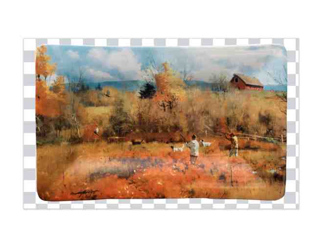 You are bidding on a platter entitled "Autumn Pheasants", which is part of the Brett Smith Art Collection from the Gitter Gallery. Brett Smith depicts flushing pheasants on a brisk fall day. Barn wood textured design is included on the back rim of this rectangular serving platter along with Brett Smith's Signature plaque. Hand crafted in Portugal.