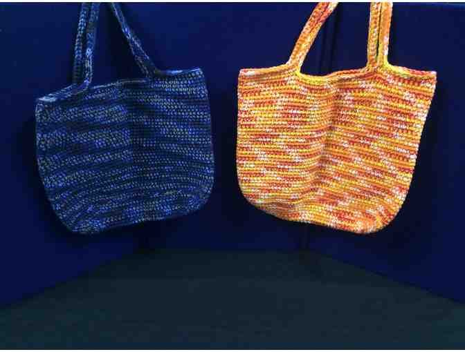 Two "Market Bags," hand crocheted, one in shades of blue, the other "sunset" colors. Both are washable and heavy gauge to carry all of your market bundles.