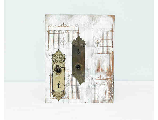 Decorate your home with "Through the Key Whole", a work of art by Tania Rodamilans. Featuring recovered wood, acrylic, spray paint, and vintage metal key "wholes" (magical entryways into other worlds), this piece is an invitation to imagine what might be on the other side of the door.