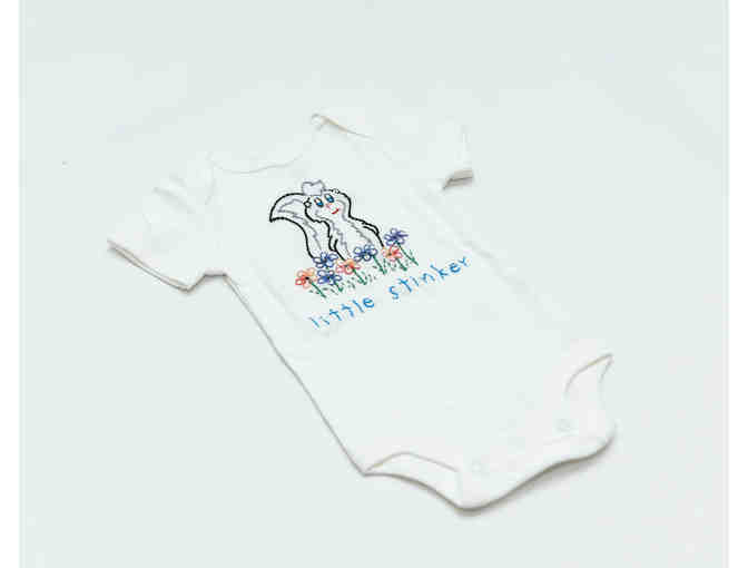 Keep your little one cozy and warm with this "Little Stinker" onesie, hand-stitched by Chicago artist Christine Bolles. Onesie is short-sleeved, size 3 months.