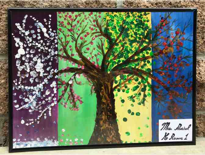 This piece was lovingly created by the cherubs in Mrs. Baird's Kindergarten class. The tree is created with paint using the student's finger prints. The students names are printed in and around the tree.