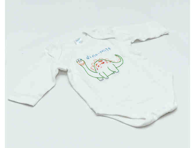 Keep your little one cozy and warm with this "Dino-Mite" onesie, hand-stitched by Chicago artist Christine Bolles. Onesie is long-sleeved, size 24 months.