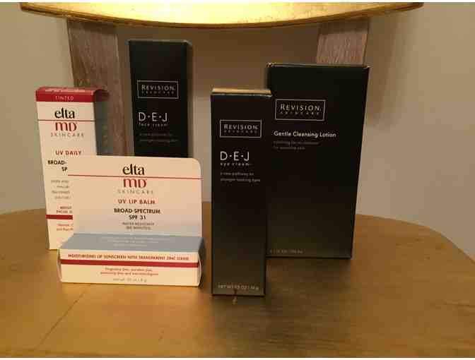 You are bidding on a skin care starter pakage by Etre Cosmetic Dermatology. This starter pack includes: Elta MD UV daily broad-spectrum SPF 1.7 oz, Elta MD UV lip balm, Revisions Skincare Gentle Cleansing Lotion 6.7 oz, Revisions Skincare DEJ Face Cream 1.7 oz and Revisions Skincare DEJ Eyecream .5 oz.