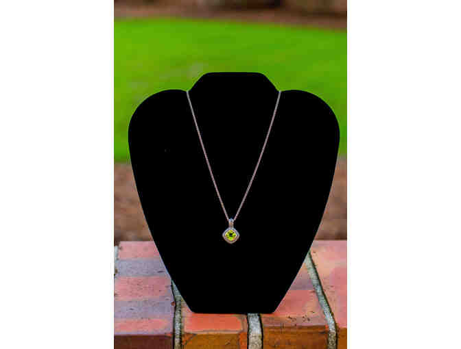 Sterling silver peridot necklace with 14k yellow gold accents on an 18" wheat chain; donated by Unforgettable Jewelry.