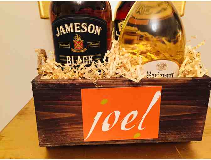 You are bidding on a crate filled with four bottles of alcohol to stock your bar, donated by Joel Catering. Bidder must verify they are age 21 years or older to purchase this item. Bottles include: Ruinart Champagne 750ml, J&B Scotch Whisky 1 liter, Jameson Black Barrel Irish Whiskey 1 liter, and Forty Creek premium barrel select whiskey 1 liter.
